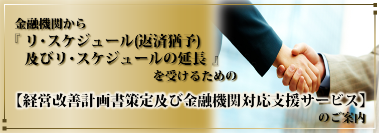 弊所が貴社のご依頼を受けて、貴社の財務部長的な立場で、リ・スケジュールに必要な計画書の立案・必要書類の作成・金融機関への積極的な説明補助業務等を行います。